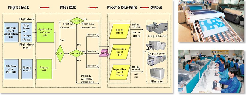 We make great efforts to adopt the newest technology. In 2001, the Company installed our first full digital workflow. As all processes are digital-based, job processing becomes more and more flexible.Compare to the traditional process of film exposing and manual film stripping and assembly, CTP can shorten the prepress processing time, improve productivity and reduce make-ready time at press room and, more importantly, enable more precise registration and improved quality.